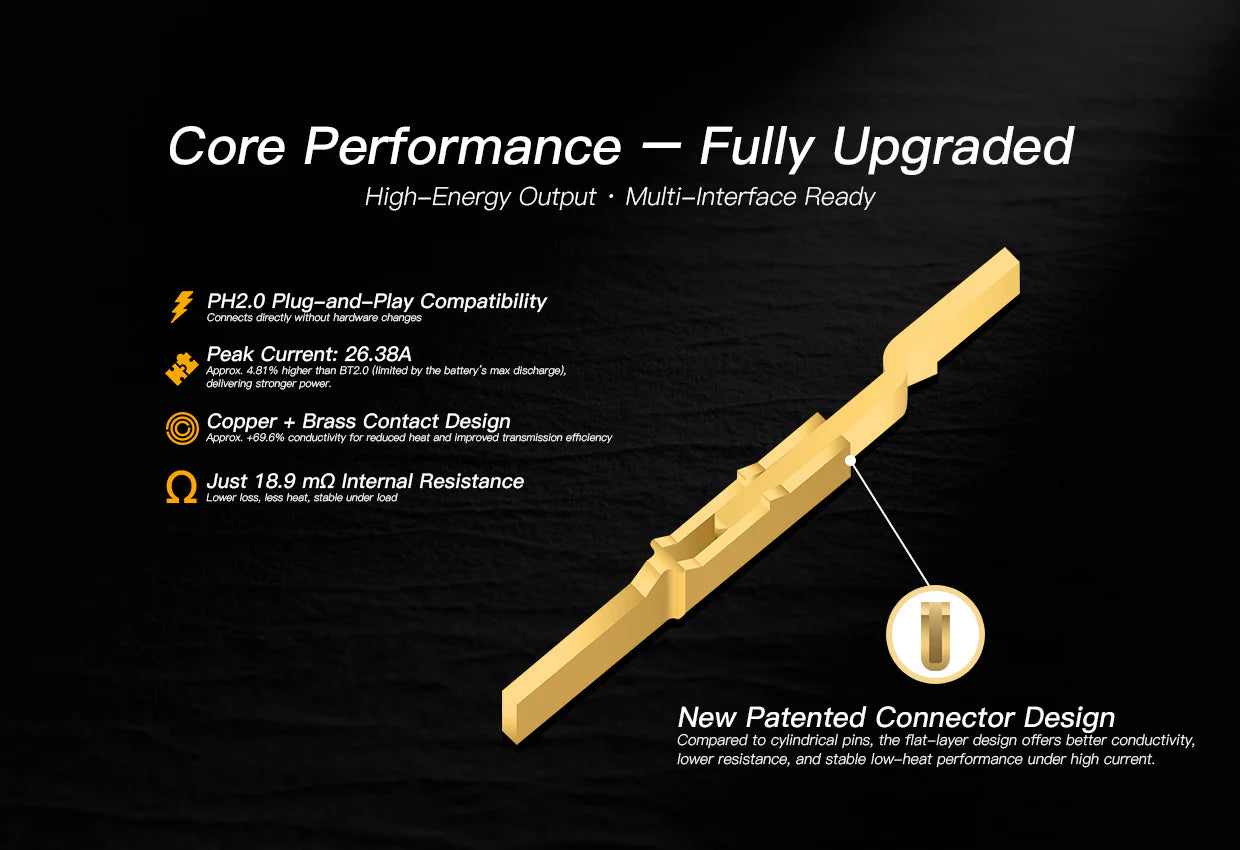 For ease of adoption, NX69 is fully backward-compatible with PH2.0 systems. Even when paired with PH2.0 Gold connectors, NX69-equipped batteries maintain about 96.38% of BT2.0’s peak current, ensuring a smooth and cost-effective upgrade path.