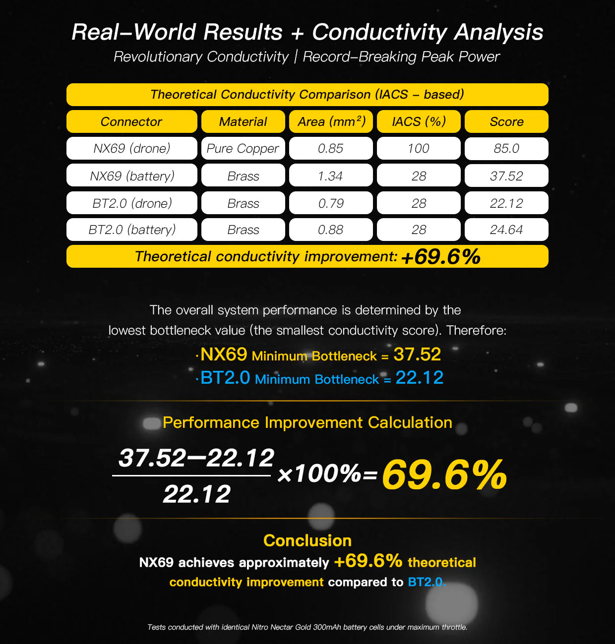 Built with pure copper (0.85mm², drone-side) and an enlarged brass contact (1.34mm², battery-side), NX69 achieves a theoretical conductivity improvement of +69.6% over BT2.0. This breakthrough in connector engineering is the inspiration behind the name “NX69.” -