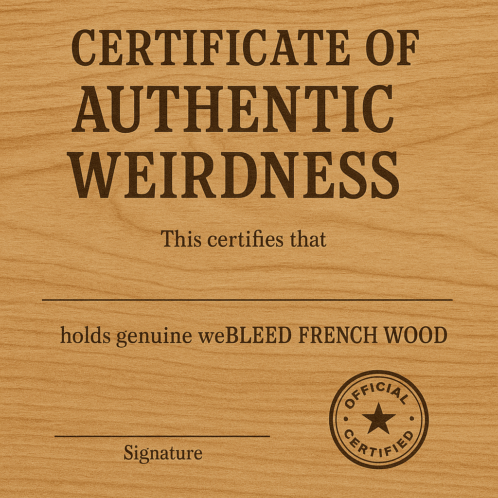 And because weBLEEDfpv is dedicated to keeping the weirdest parts of FPV history alive, we’re proud to offer the weBLEED FRENCH WOOD™ BLOCK — a handcrafted, laser-branded tribute to that glorious moment of confusion and chaos.